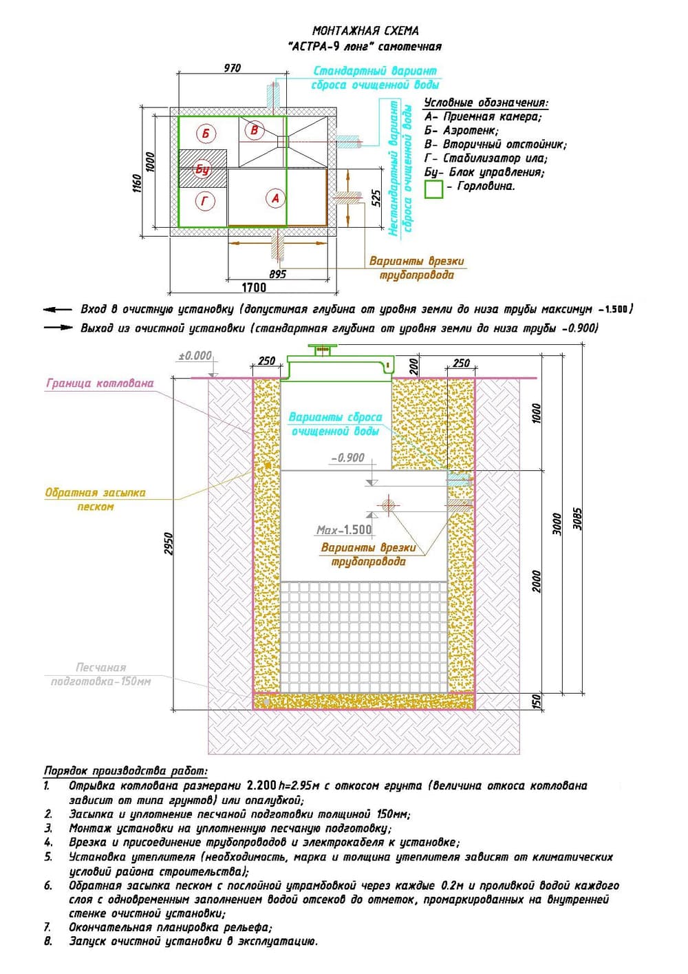 Канализации Юнилос Астра 9 отличаются по высоте и уровню врезки подводящей канализационной трубы в зависимости от глубины залегания выходящей трубы из дома и расстояния, на котором будет располагаться станция.